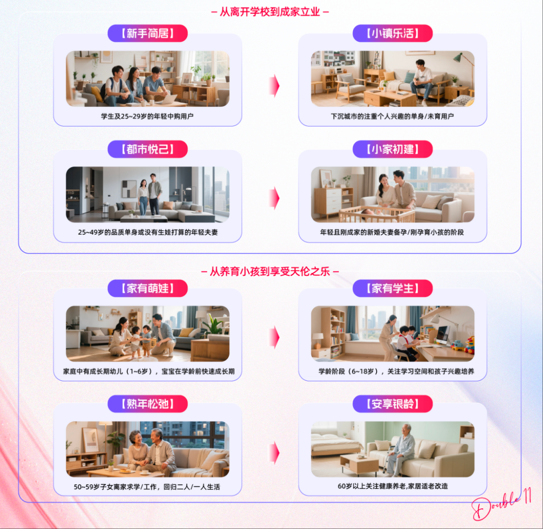 比如,针对处于独身阶段的“外行翰居”和“小镇乐活”提供高性价比、多功能的初学级产物;做事“皆市悦己”和“小家初建”的年青家庭,侧重保举筹划感、品性感和场景化的套装产物;围绕“家有萌娃”和“家有学生”的老娶妻庭,安全、环保、强收纳等功能性产物更具上风;为“熟龄自便”和“安享银龄”的老年东说念主群提供平安、健康、适老化校正的产物和做事。